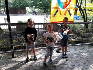 In diesem Jahr wurden die Kinder unserer Sommerferienbetreuung ins Mittelalter entführt. Spektakulärer Ritterkämpfe, Musik und Tanz standen auf dem Programm. In der ersten Woche wurden prachtvolle Steckenpferde und Helme gebastelt. Außerdem konnten sich die Kinder herrlich auf der großen Hüpfburg austoben. Zu einem echten Ritter gehören natürlich auch Schild und Schwert. Diese wurden von den kleinen Knappen in liebevoller Handarbeit in der zweiten Woche hergestellt. Gut ausgestattet ging es dann in die dritte Woche mit den Ritterspielen. Die kleinen Anwärter absolvierten verschiedene Stationen, wie Bogenschießen, Pferderennen oder Lanzenstechen. Auch mit einem selbstgebauten Katapult und Tennisbällen wurde treffsicher ins Ziel geschossen. Einen krönenden Abschluss fanden die Ritterspiele in einer feierlichen Zeremonie, in der die Knappen zum Ritter geschlagen wurden. Viele Eltern wohnten diesem tollen Ereignis bei. Kinderaugen leuchteten, als König Richard Löwenherz (OGS Leitung Karin Scheulen) sein Schwert „Excalibur“ zückte und Ritternamen, wie „der Starke“ oder „die Tapfere“ verkündete.