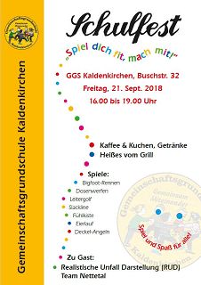 Am Freitag, 21.09.2018 fand unser Schulfest auf dem Schulhof der GGS statt. Um 16.00 Uhr eröffneten unsere vierten Klassen mit einem stimmungsvollen Tanz, der auch schon beim Tanzfest der Grundschulen im letzten Schuljahr begeisterte. Die Kinder tobten sich an verschiedenen Spielstationen, wie der Slackline, Eierlauf Seilchenspringen, Entchen angeln, Strumpfhosen-Bowling, Rollstuhl-Rennen und dem Puste Parcours aus. Auch Dosen werfen, Leitergolf, Deckel fischen, Bigfoot-Rennen und die Fühlkiste, standen bei den Kindern hoch im Kurs. Im Anschluss an die Spielestationen gab es kleine Preise für alle. Gestärkt wurde sich mit Salaten und Würstchen vom Grill. Ganz begeistert waren die Kinder vom Team der Realistischen Unfall Darstellung Nettetal (RUD), die den Kindern täuschend echte Wunden schminkten. Von Schnittverletzungen über Platzwunden und Knochenbrüchen war alles dabei.